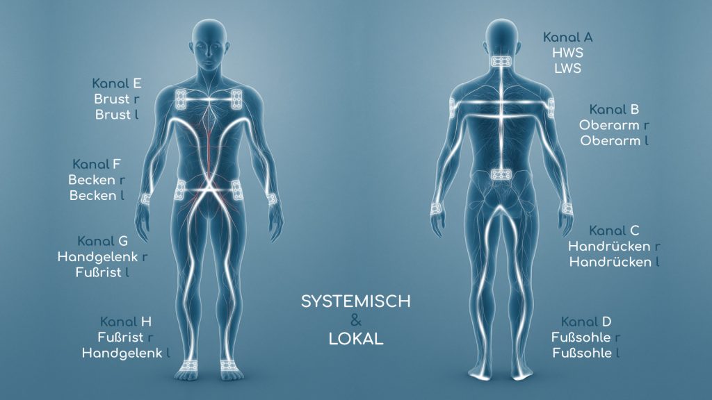 - Die Elektrodenplatzierung sorgt für eine gezielte Stromverteilung entlang der anatomischen Strukturen und bioelektrischen Leitbahnen des Körpers.